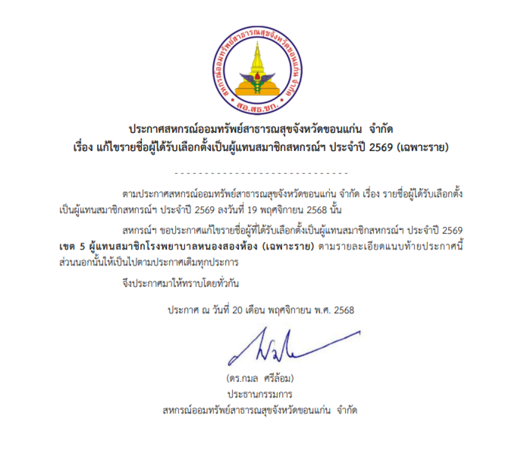 ประกาศ แก้ไขรายชื่อผู้ได้รับเลือกตั้งเป็นผู้แทน 2569 (เฉพาะราย))